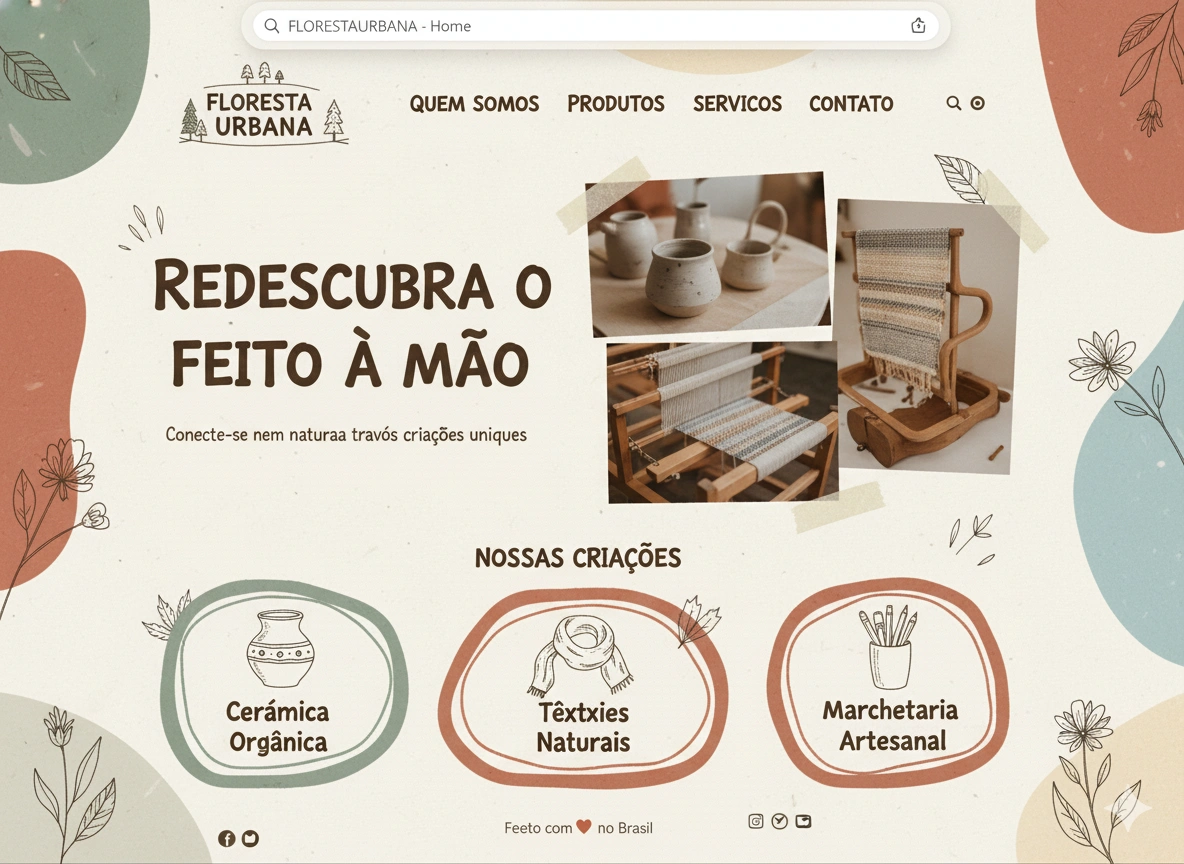 Formas orgânicas, ilustrações desenhadas à mão, texturas naturais, colagens de fotos, animações suaves e interativas.