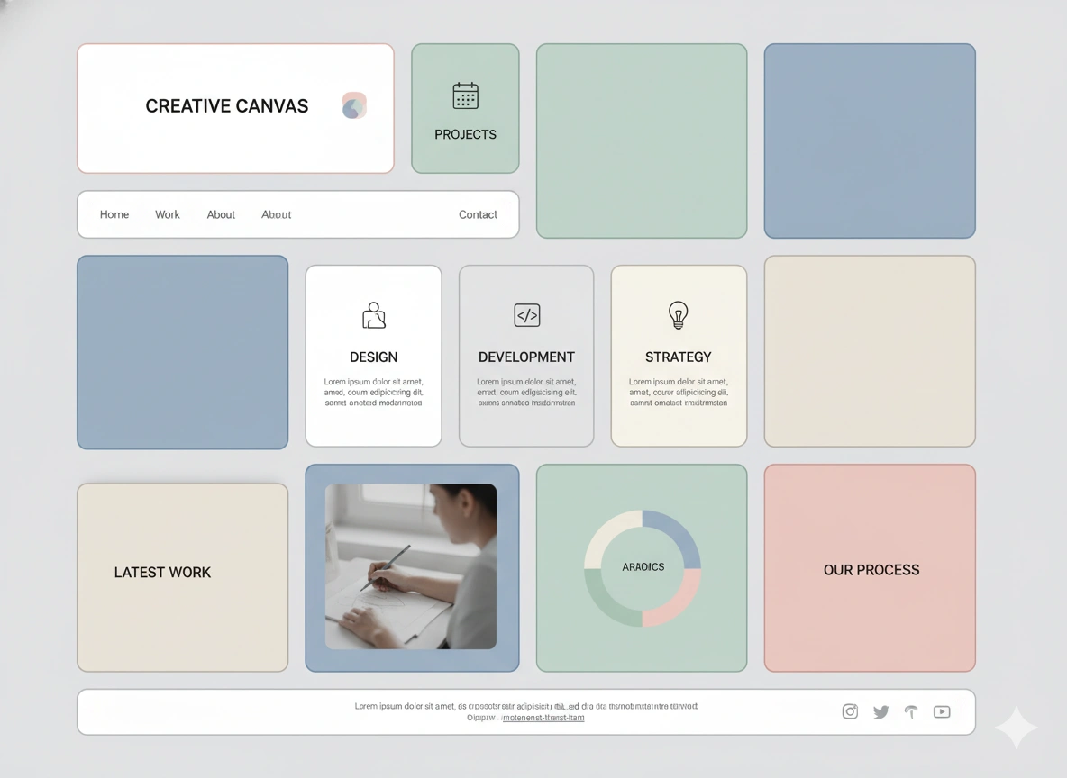 Blocos geométricos (retos ou arredondados), estrutura de grid clara, cores pastéis ou neutras, conteúdo separado visualmente.