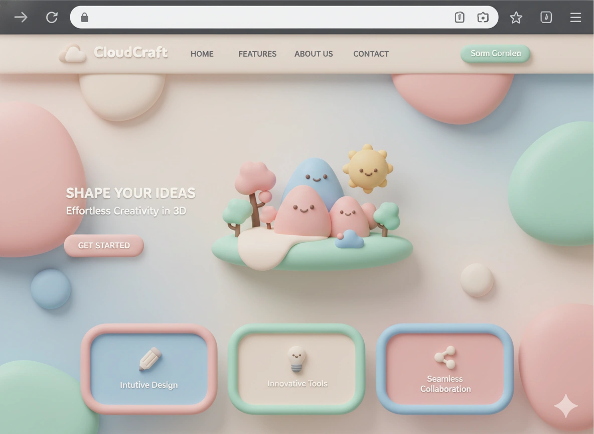 Elementos 3D com aparência de argila, sombras suaves, luzes difusas, cores pastéis, gradientes suaves, e transições fluidas.