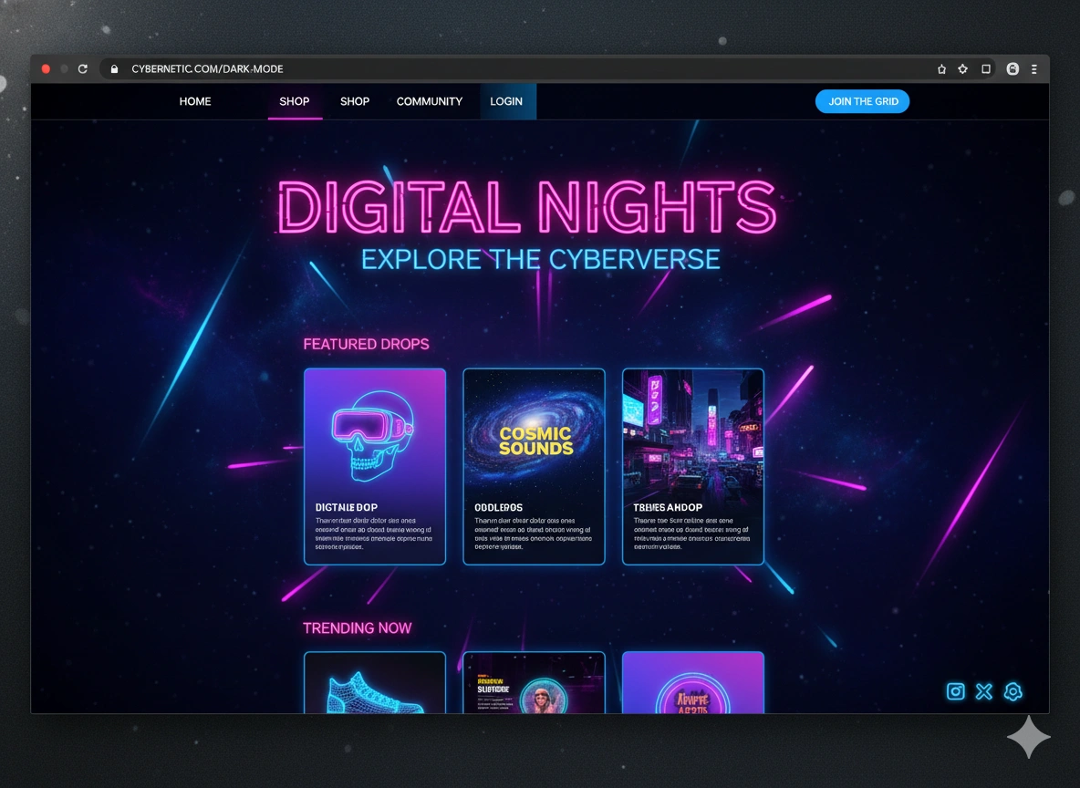Fundos escuros (preto, cinza, azul profundo), luzes de destaque (neon, degradês), boa legibilidade, pode ser minimalista ou maximalista.