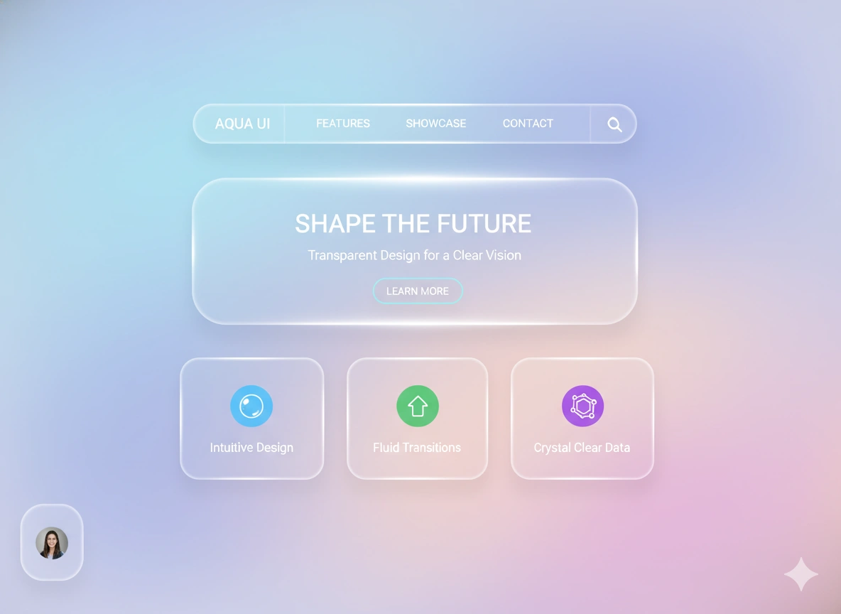 Efeito de vidro translúcido e suave, transparências, desfoques (blur), luzes e reflexos, bordas arredondadas.
