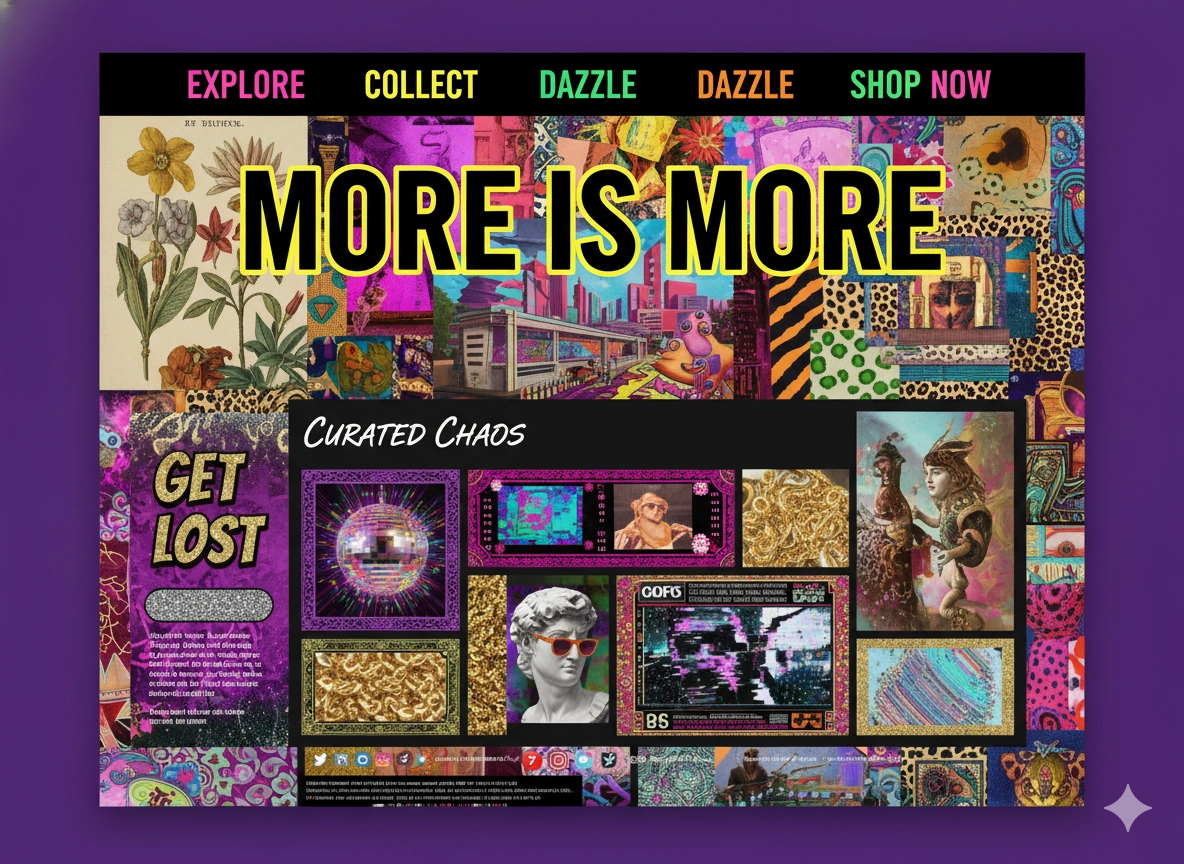 Cores vivas, contrastes fortes, misturas de estilos (retrô + digital), tipografias exageradas e expressivas, uso de emojis, glitchs e motion rápidos.