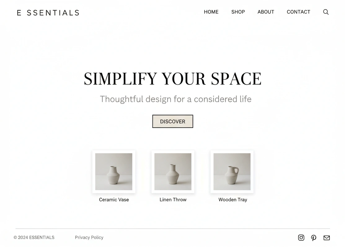 Espaços vazios, poucos elementos visuais, cores neutras (preto, branco, cinza, bege), foco na tipografia e hierarquia.