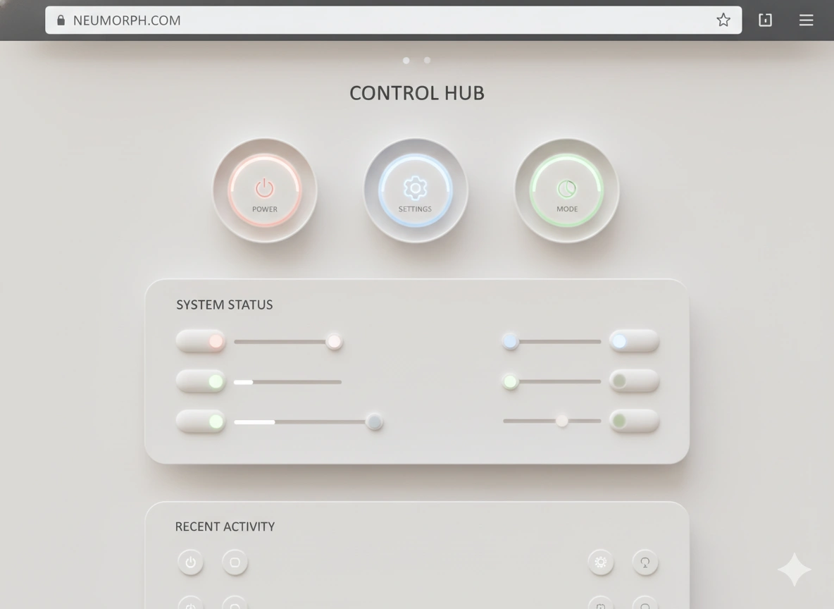 Realismo digital e tátil, efeitos de sombra e relevo, botões e cards com aparência “pressionada”