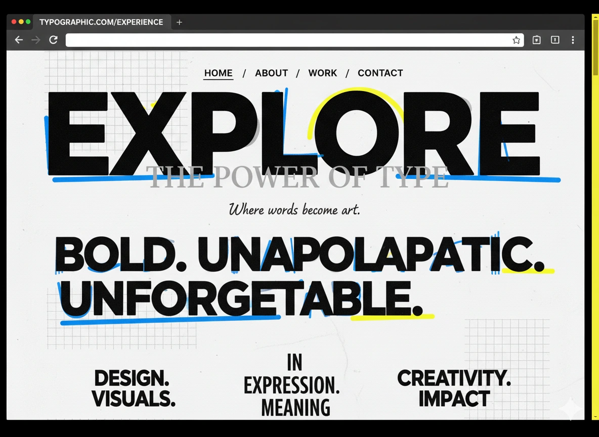 Tipografia gigante, combinações ousadas de fontes, tamanhos e pesos, texto usado como elemento visual principal.